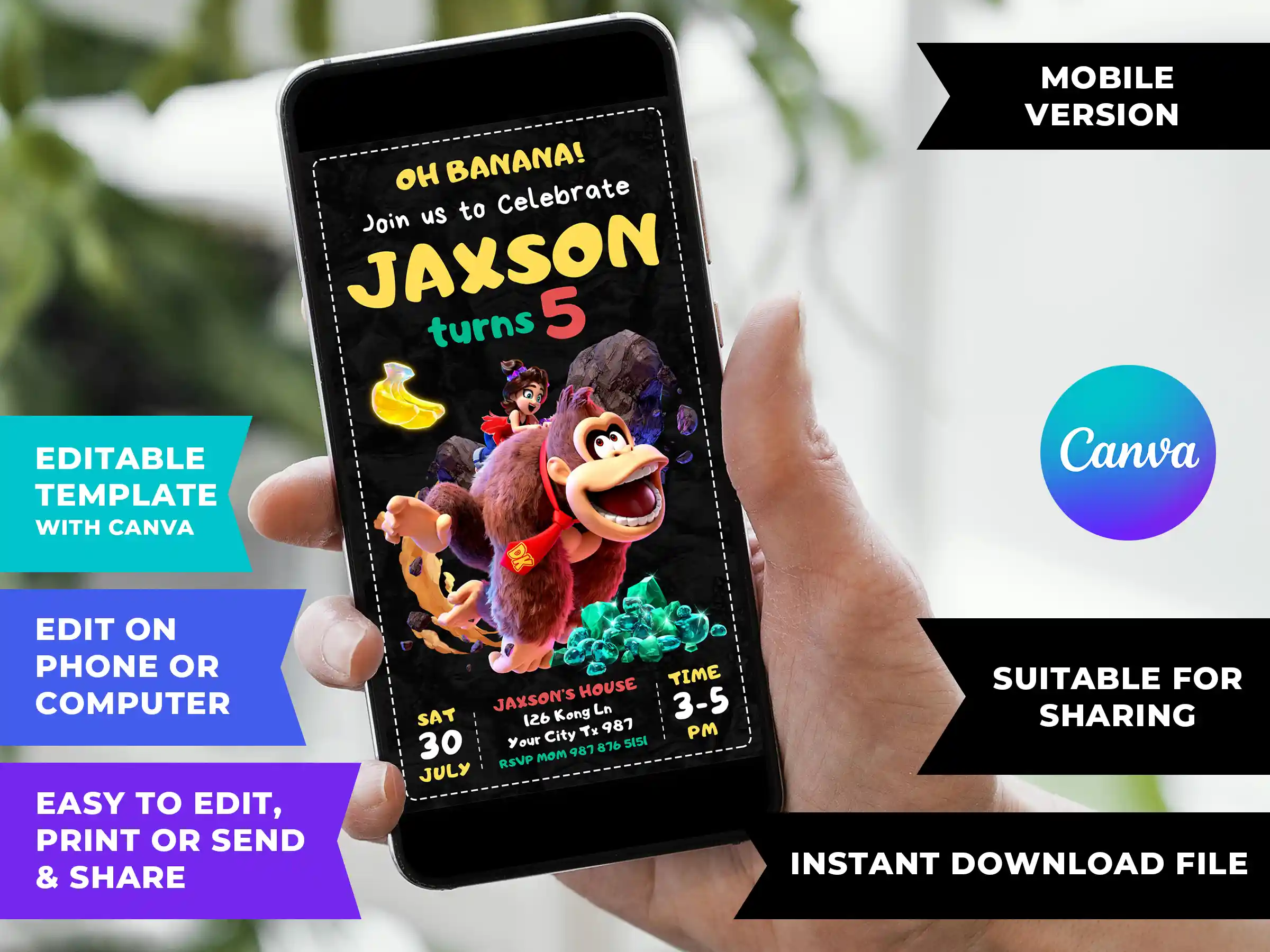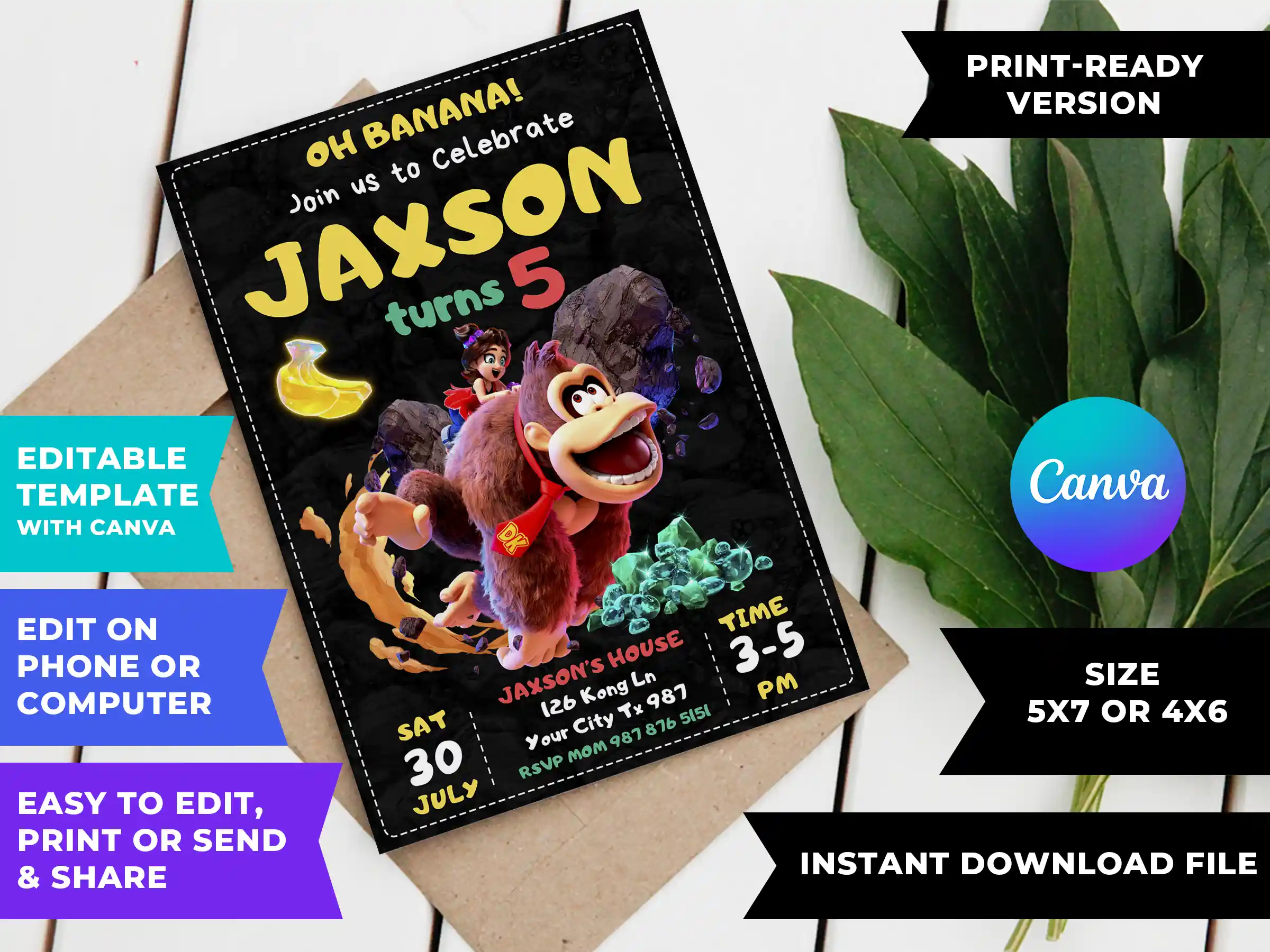 You can instantly purchase and personalize this Donkey Kong Bananza Birthday Invitation right on Canva within minutes. No design skills or special software are required! Whether you are using your phone, tablet, or computer, an internet connection is all you need to get your jungle journey started.