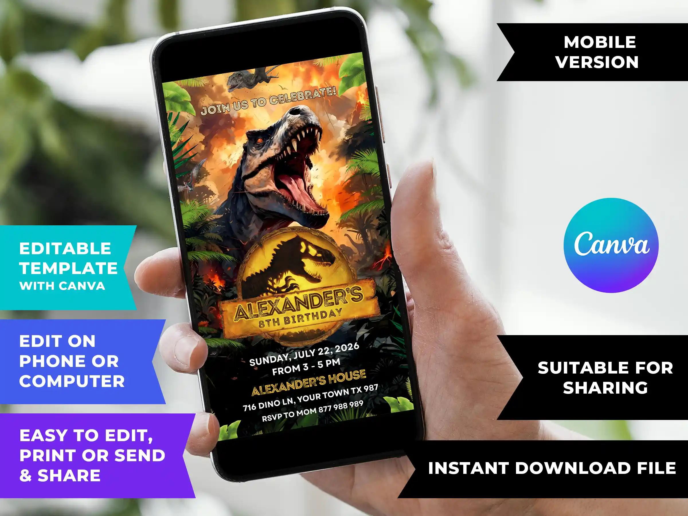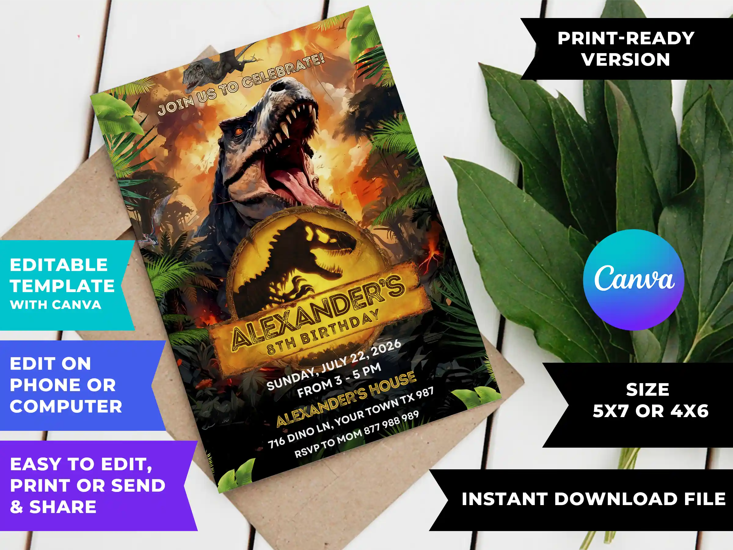 You can instantly purchase and personalize this Jurassic World Birthday Invite right on Canva within minutes. No design skills or special software are required! Whether you are using your phone, tablet, or computer, an internet connection is all you need to get your party roaring.