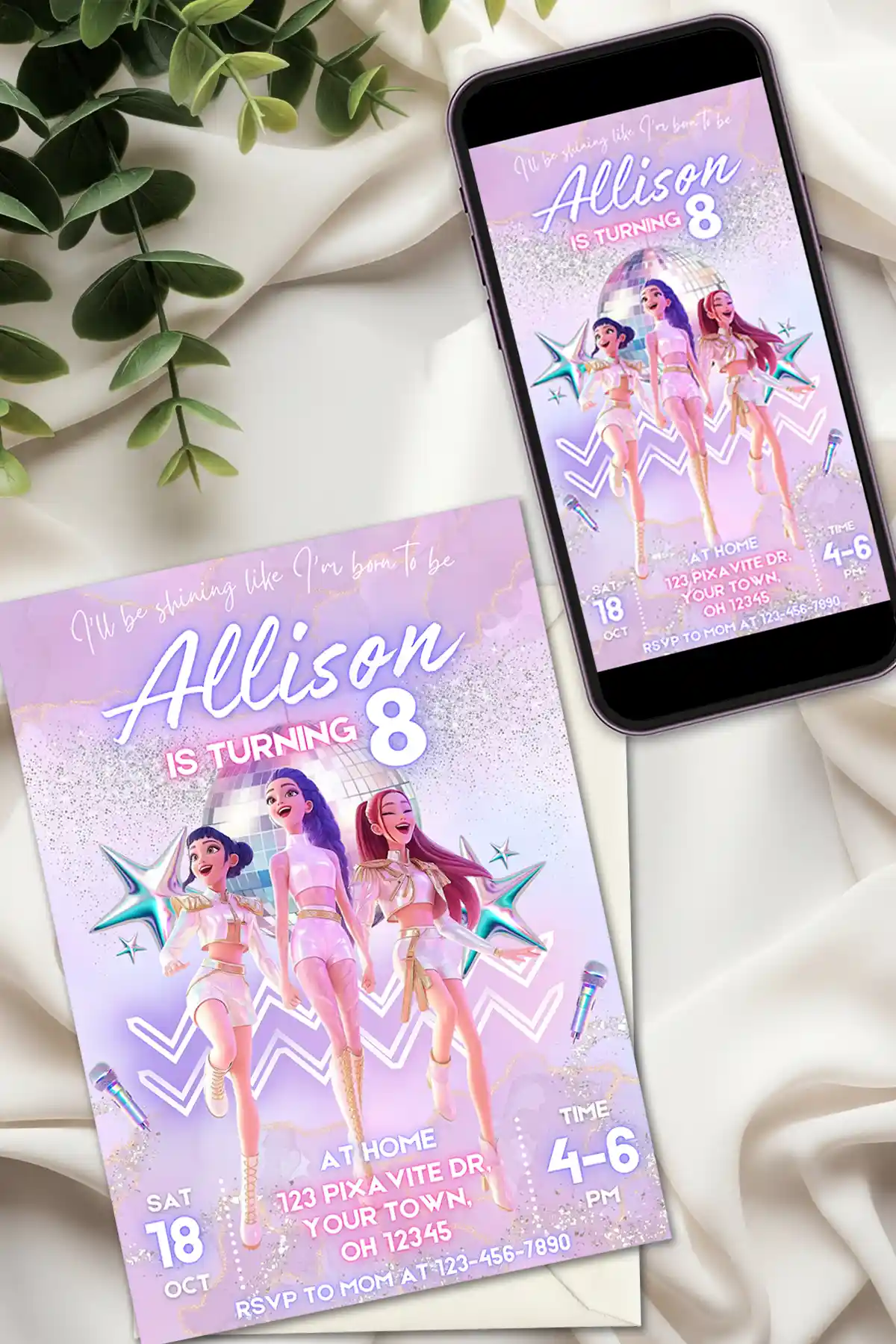 Transform your girl’s birthday into a sparkling K-pop event filled with rhythm, magic, and unforgettable memories. Don’t wait, order this Huntrix Invitation and get the party started with Rumi, Mira, and Zoey!