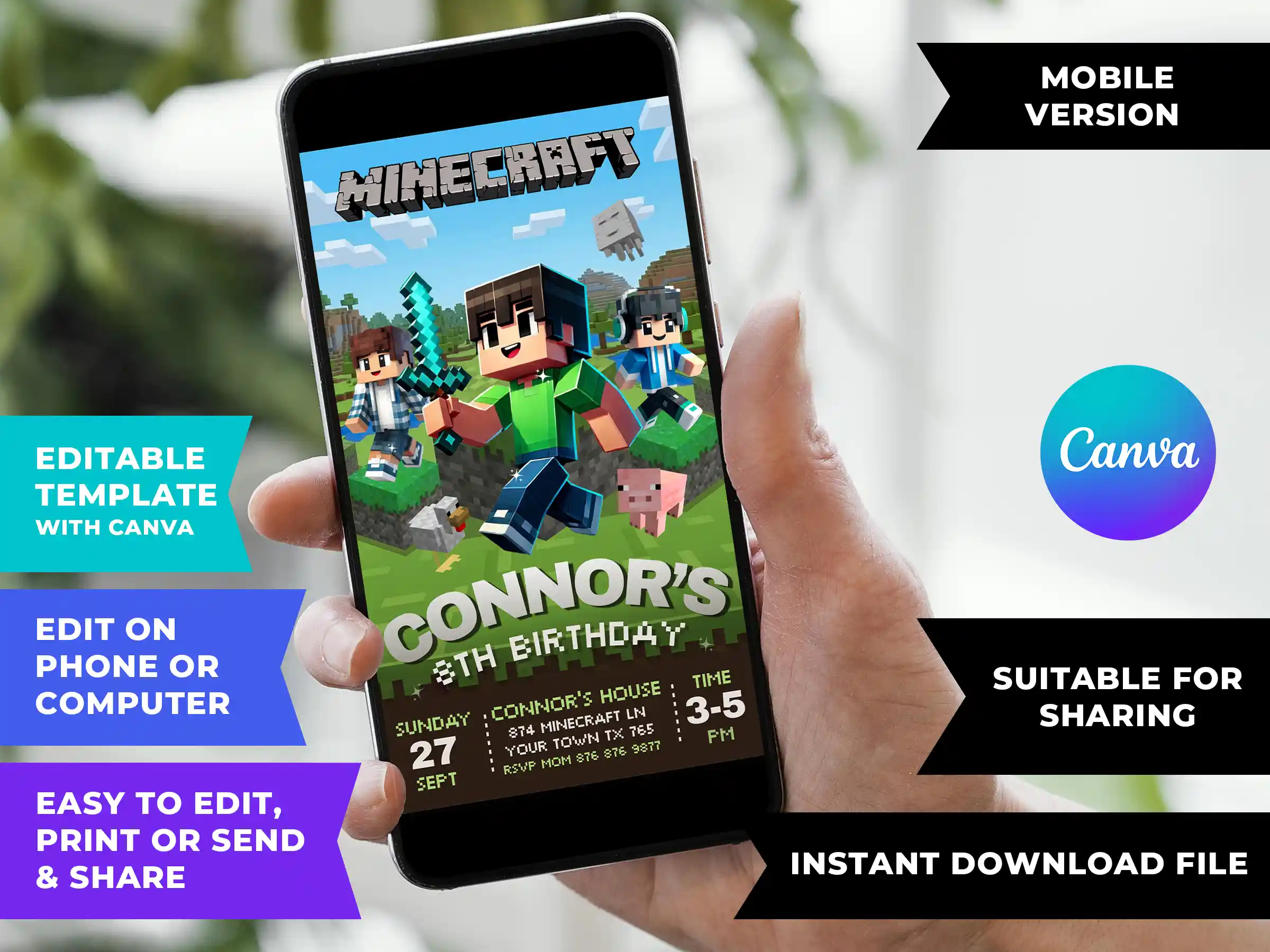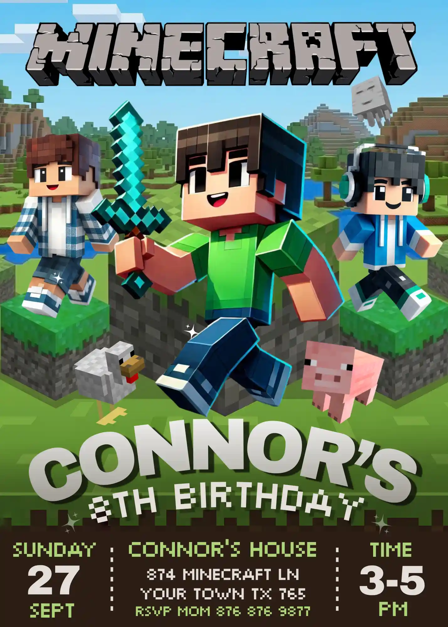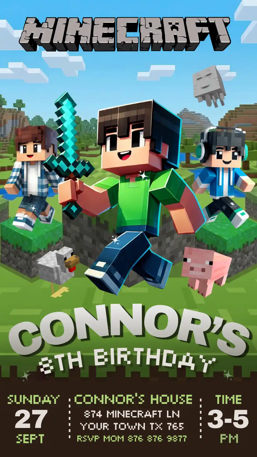 If you want a Minecraft party invitation that looks like it belongs in the game itself, and anyone who needs a Minecraft digital invitation for WhatsApp, iMessage, text, or social media sharing, this is it.