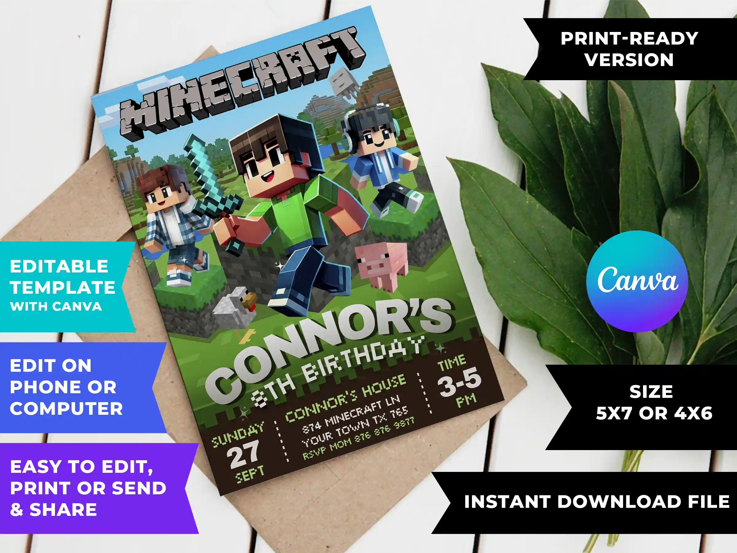 Terrific Minecraft Birthday Invitation for your boy’s birthday party. This editable template lets you customize every detail right from your phone in minutes inside Canva – no design skills needed. Choose print size (5×7″ or 4×6″) or the Mobile/WhatsApp/iMessage size (1080x1920px) for digital sharing. Instant download.