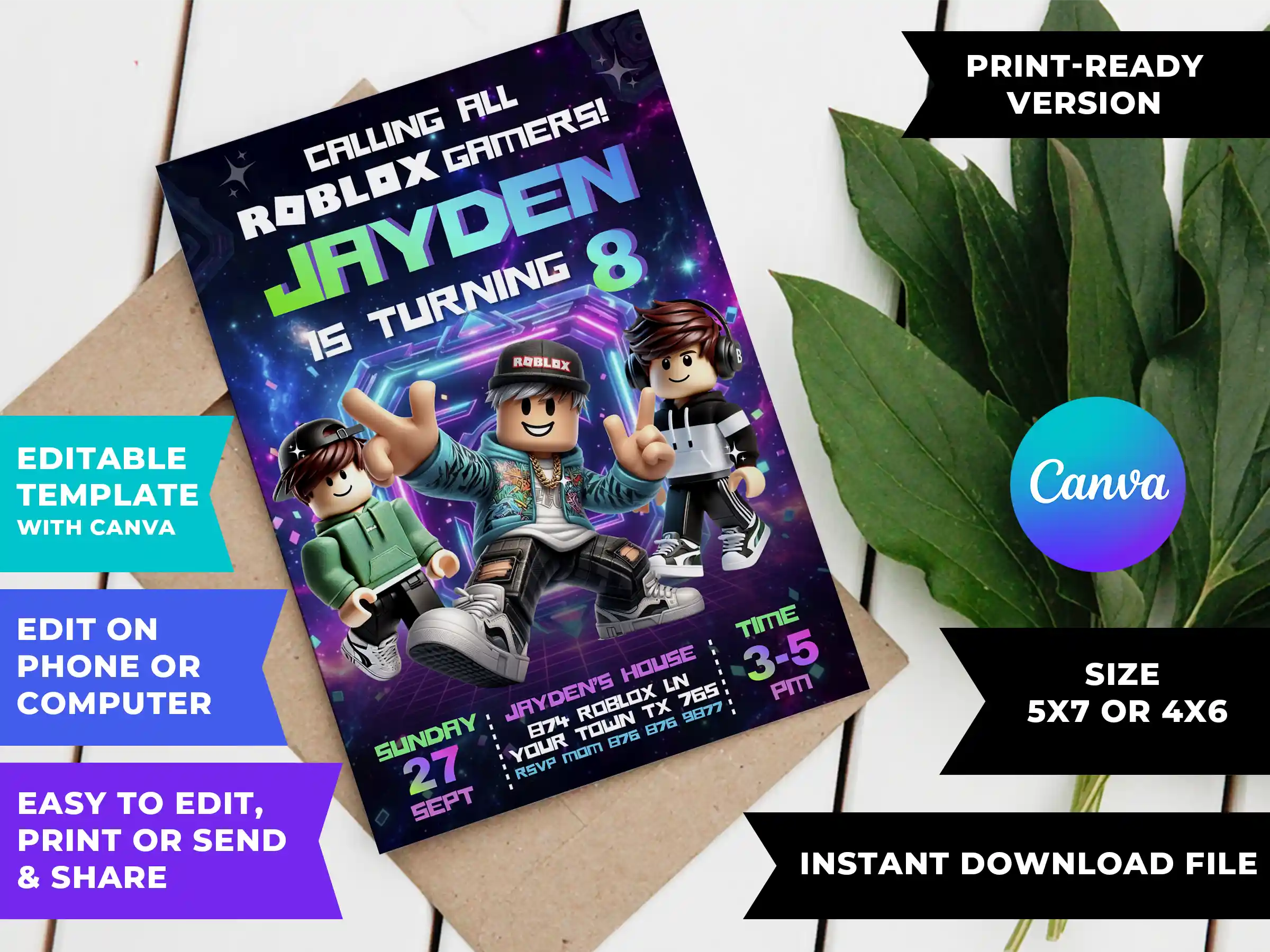 This is for parents whose child measures time in Roblox sessions and whose friend group is basically their in-game squad. It is perfect if you are planning a Roblox birthday party for a boy or girl aged 5 and up, if you want an invitation that feels like it came from inside the game rather than a party supply store, or if you have scrolled through options on Zazzle, Party City, Walmart, or Evite and nothing matched the energy your kid was looking for.
