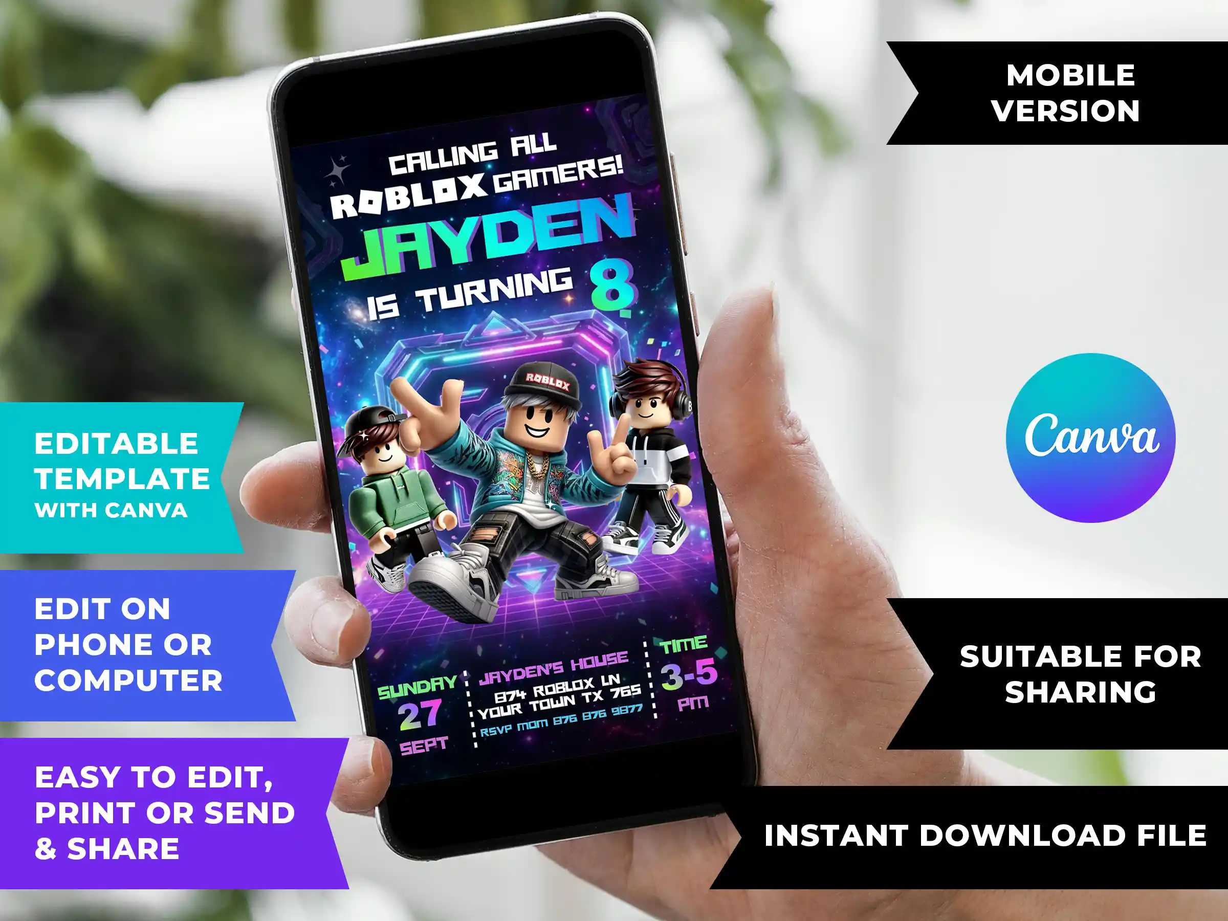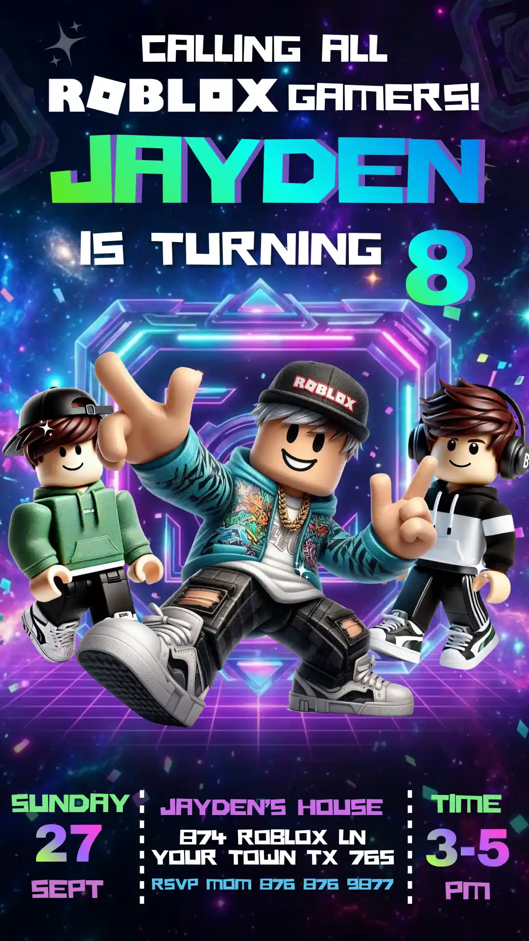 If you want a Roblox party invitation with the neon, the style, and the characters kids actually recognize, and anyone who needs a Roblox digital invitation for WhatsApp, iMessage, text, or social media sharing, this is it.