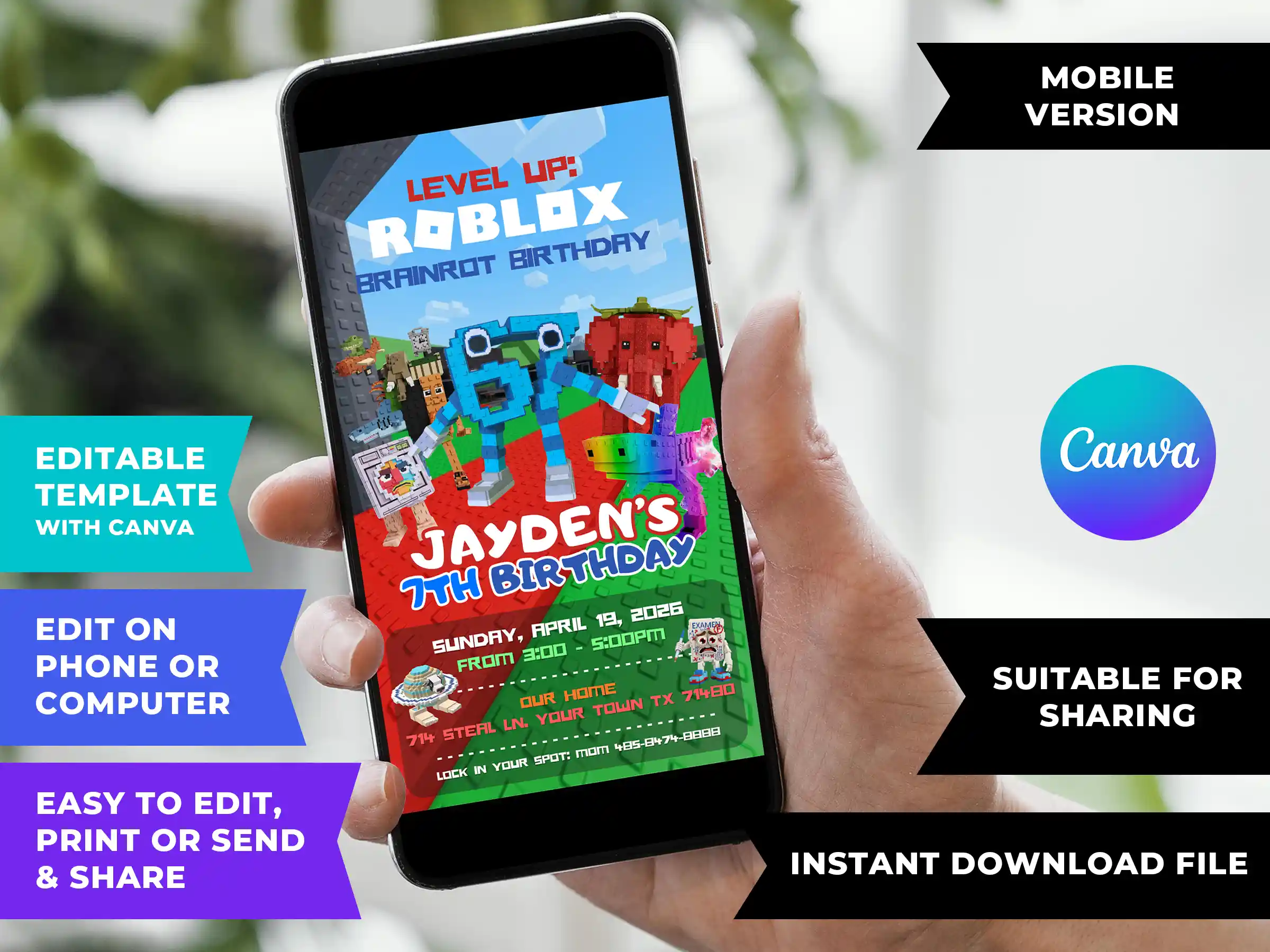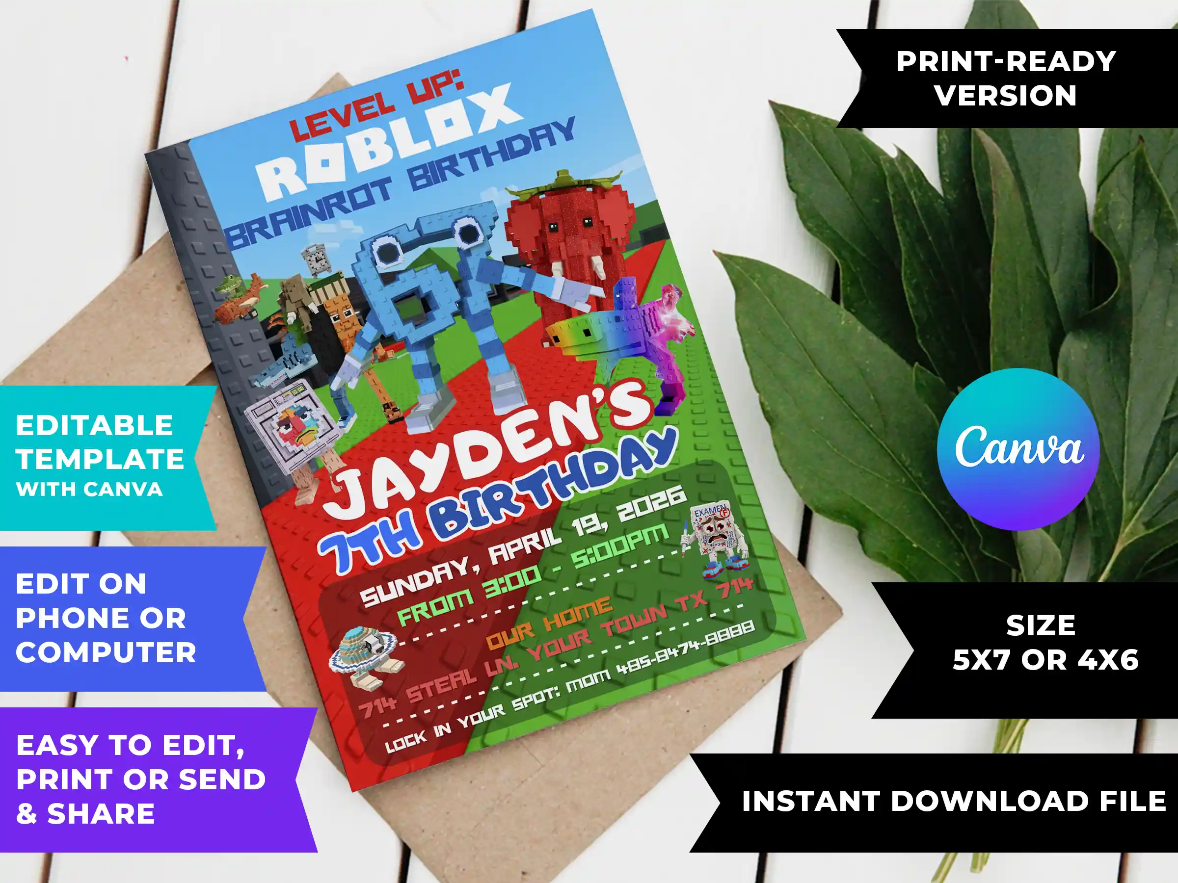 This is for parents of kids who talk about Roblox constantly, know every Brainrot character by name, and would absolutely lose it seeing their birthday party announced like an in-game event. It’s perfect if you’re planning a Roblox birthday party for a boy or girl aged 5 and up, if you want an invitation that feels current and exciting rather than generic, or if you’ve searched through options on Zazzle, Party City, Walmart, or Evite and couldn’t find anything that matched what your kid is actually into right now.