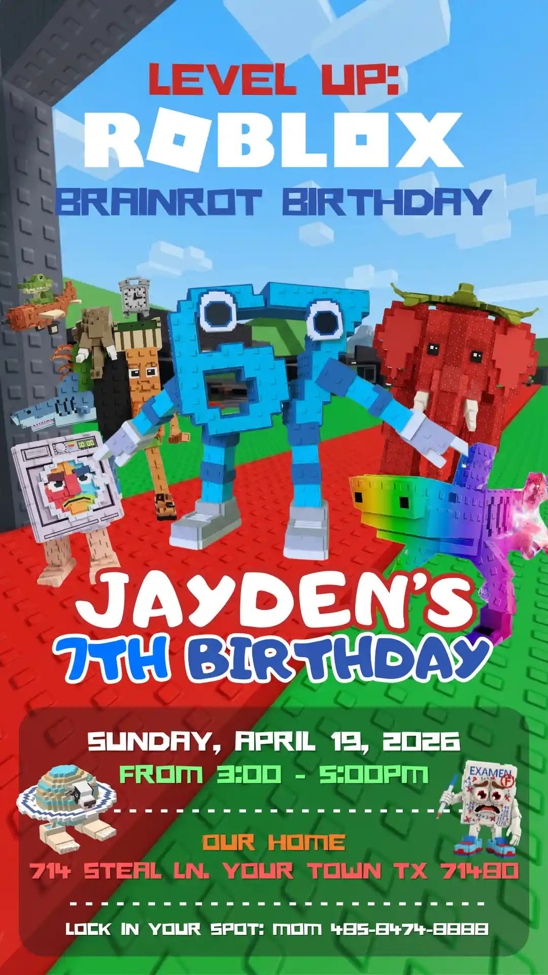 | Design | Roblox world background, Brainrot character squad, “Level Up: Roblox Brainrot Birthday” headline, game-styled party details, “Lock In Your Spot” RSVP section |