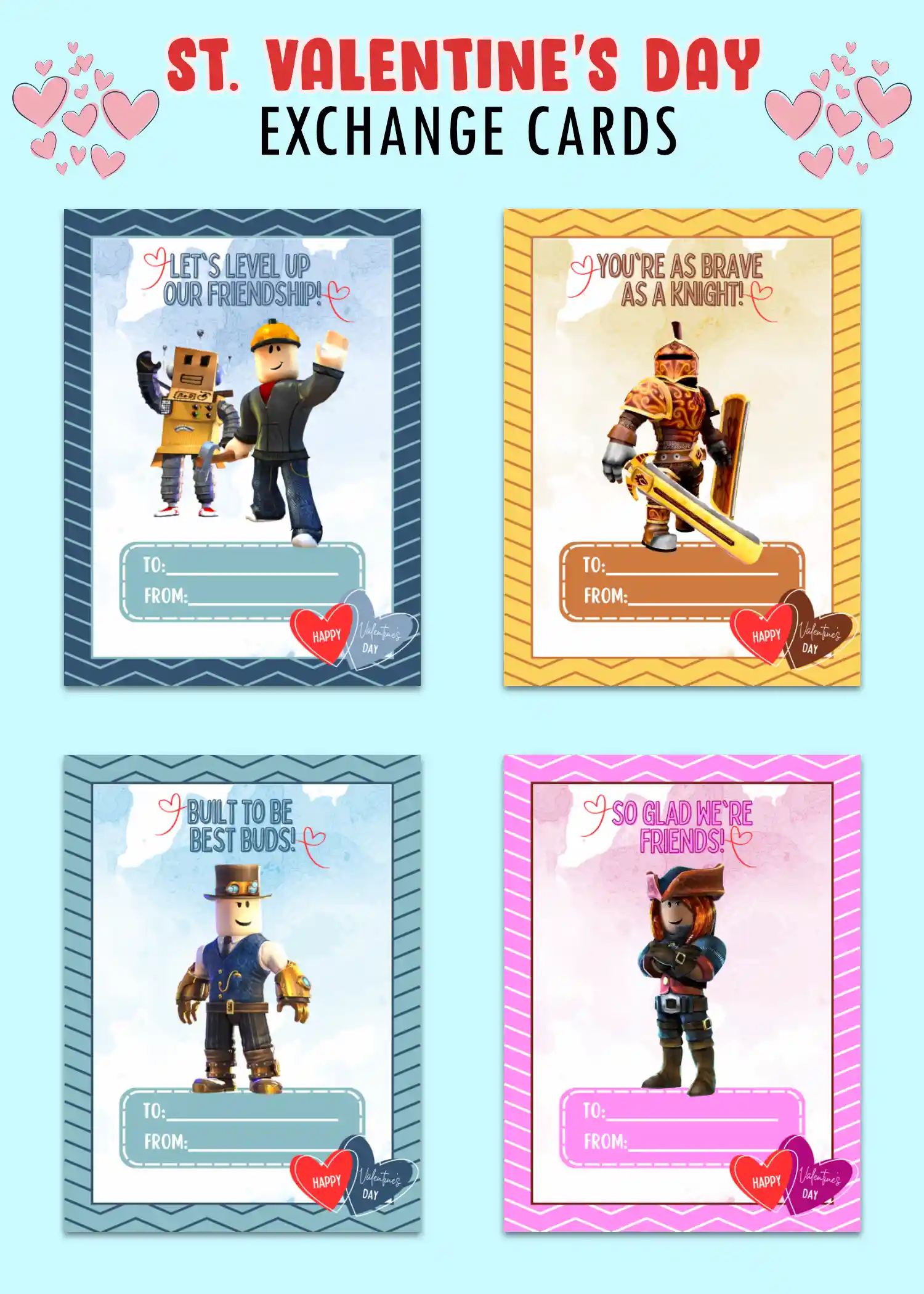 – Printable Cards for kids: Designed for kids who love gaming and creativity, these Roblox Exchange cards are perfect for school classroom exchanges and make sharing Valentines easy, exciting, and unforgettable.