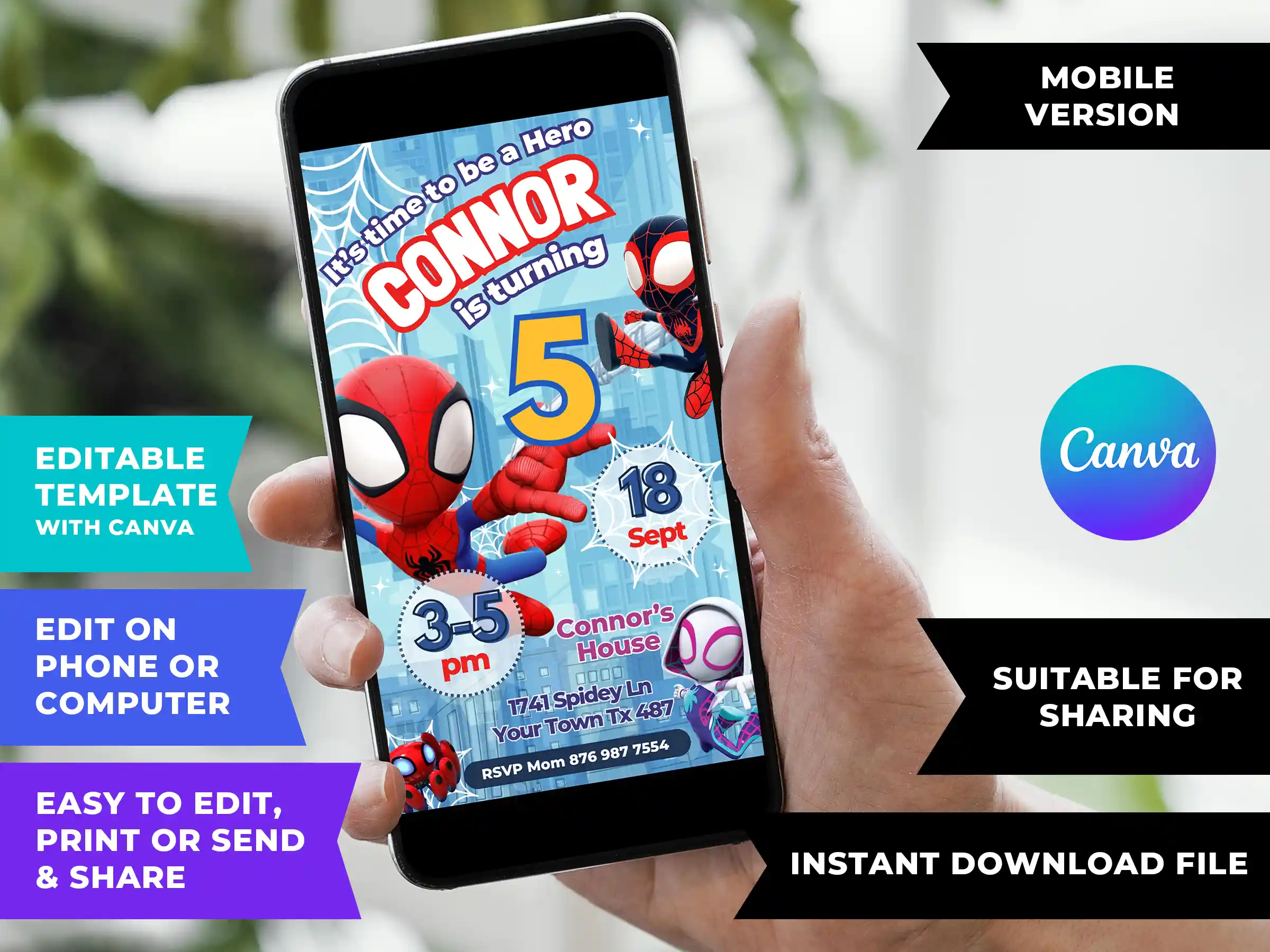 Tremendous Spidey and His Amazing Friends Birthday Invitation for your boy’s birthday party. This editable template lets you customize every detail right from your phone in minutes inside Canva – no design skills needed. Choose print size (5×7″ or 4×6″) or the Mobile/WhatsApp/iMessage size (1080x1920px) for digital sharing. Instant download.