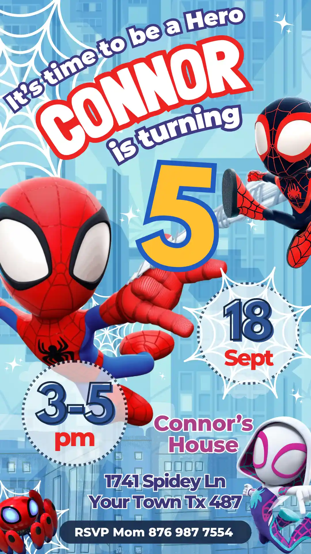 This is a digital, editable Spidey and His Amazing Friends birthday invitation template built to work inside Canva, the free design tool you can use right from your phone or laptop. It features the whole amazing crew – Spidey, Ghost-Spider, Spin, and Trace-E – swinging and leaping across a bright blue city skyline packed with spider webs, bold colors, and the cheerful energy that makes every little fan of the Disney Junior show light up on sight. It looks like it was pulled straight from the screen, because the illustration quality is just that good – and you get to put your child’s name on it.