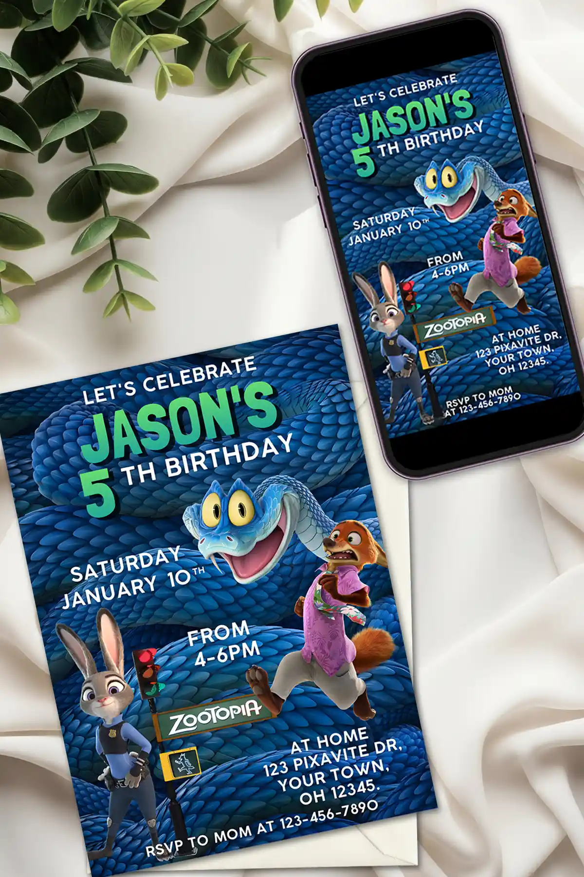 Perfect if your are planning a themed party that’s full of mystery, humor, and heart, this invitation features your favorite heroes, Officer Judy Hopps and Nick Wilde, alongside the friendly pit viper, Gary De’Snake. The dramatic deep blue snake pattern promises an exciting celebration based on the importance of integration and friendship!
