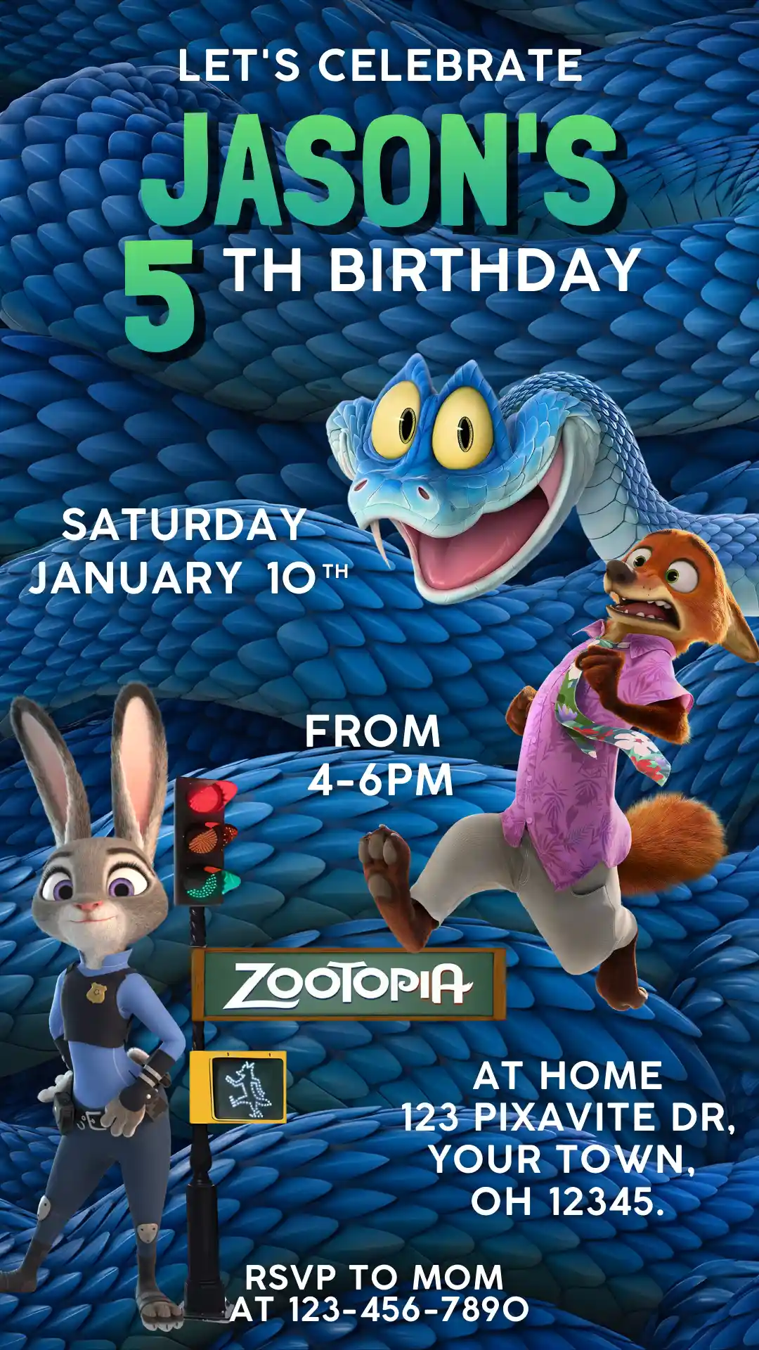 High-Impact Design: The striking blue, reptilian background and the intense, engaging poses of Judy, Nick, and Gary De’Snake create an unforgettable invitation that jumps off the page.